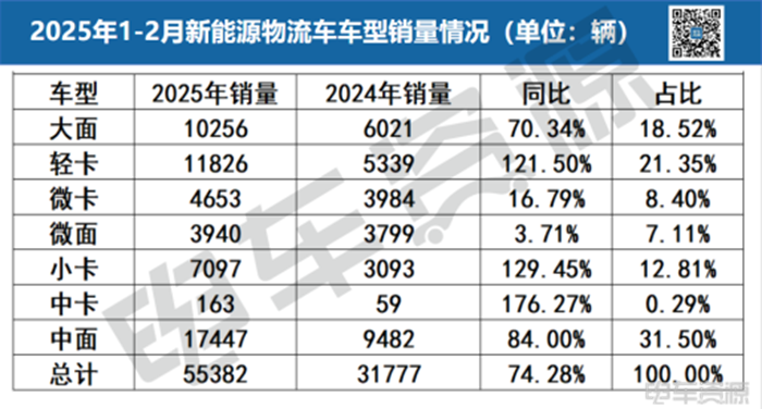 据电车资源统计,2025年2月,我国新能源物流车总销量为37031辆(不含物流重卡、皮卡),同比增长173%。1-2月,新能源物流车累计销量55382辆,同比增长74.82%,呈现出 “1 月平稳奠基、2 月爆发式增长”的特征。