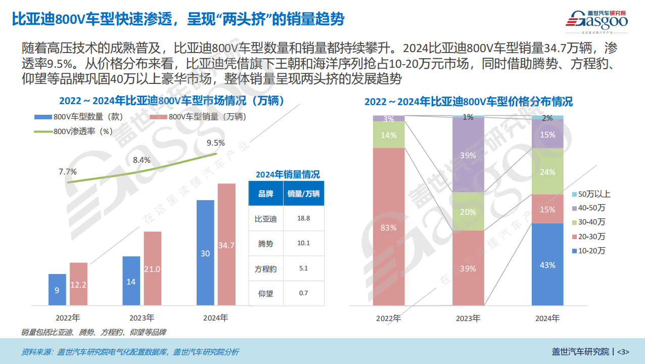 比亚迪800v车型快速渗透,呈现“两头挤”的销量趋势。2022-2024年,比亚迪800V车型渗透率从7.7%提升至9.5%,车型数量从9款增至30款,销量更从12.2万辆跃升至34.7万辆,规模增长显著。高压技术普及推动下,车型矩阵与市场接受度同步提升。