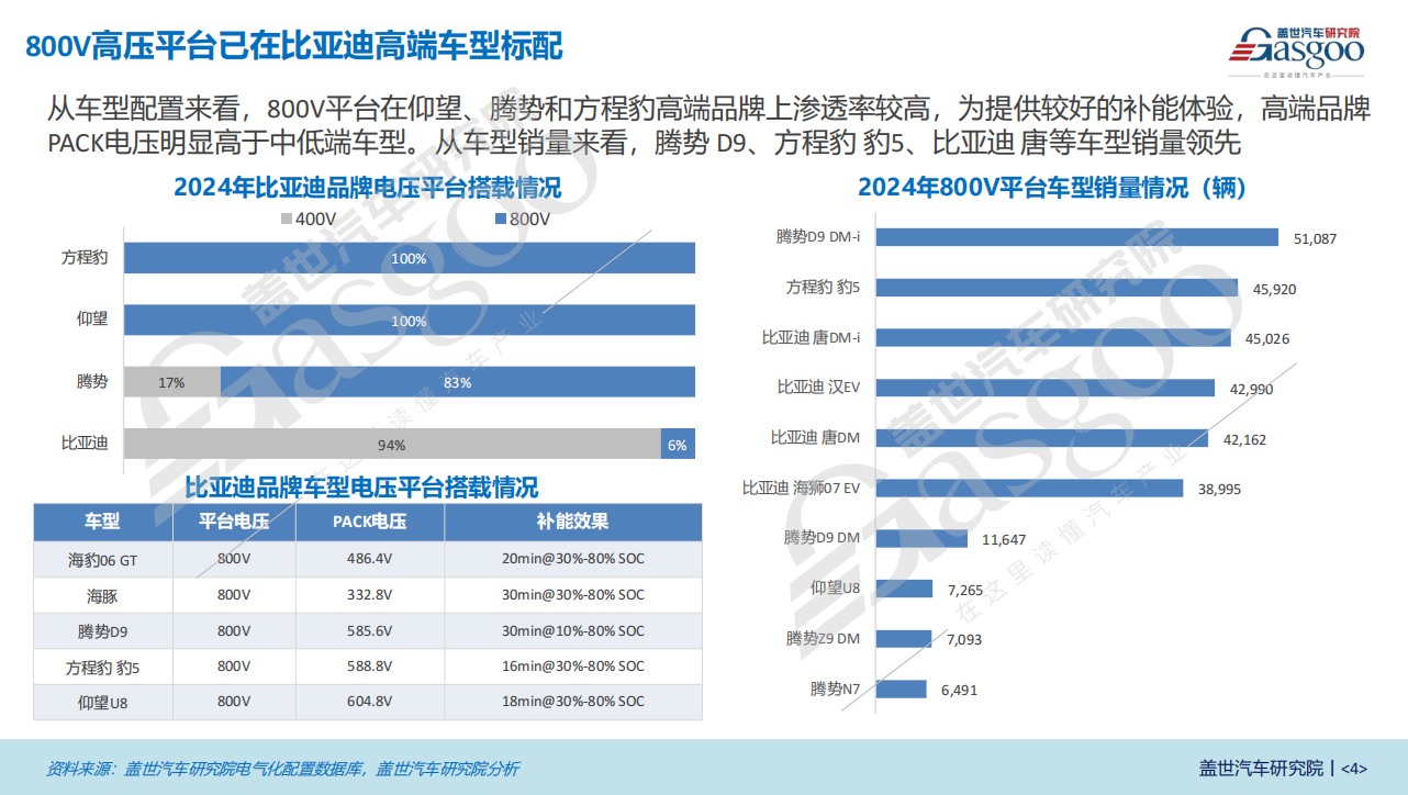 800V高压平台已在比亚迪高端车型标配。2024 年,方程豹、仰望两大高端品牌800V平台渗透率达100%,腾势品牌800V平台渗透率也高达83%。在 2024 年 800V 平台车型销量榜单中,腾势 D9 DM-i(51,087 辆)、方程豹豹 5(45,920 辆)、仰望 U8(7,265 辆)等高端车型均标配 800V 平台,更通过销量验证了该配置的市场认可度。从车型电压配置看,高端车型采用800V整车电压+800VPACK电压方案,包括仰望 U8(PACK 电压 604.8V)、方程豹豹 5(PACK 电压 588.8V)、腾势 D9(PACK 电压 585.6V)等车型,凭借 800V 平台实现更优补能效果,如方程豹豹 5 仅需 16 分钟即可完成 30%-80% SOC 补能,仰望 U8 耗时 18 分钟,显著优于中低端车型,进一步凸显 800V 高压平台在高端车型上的标配价值与技术优势。