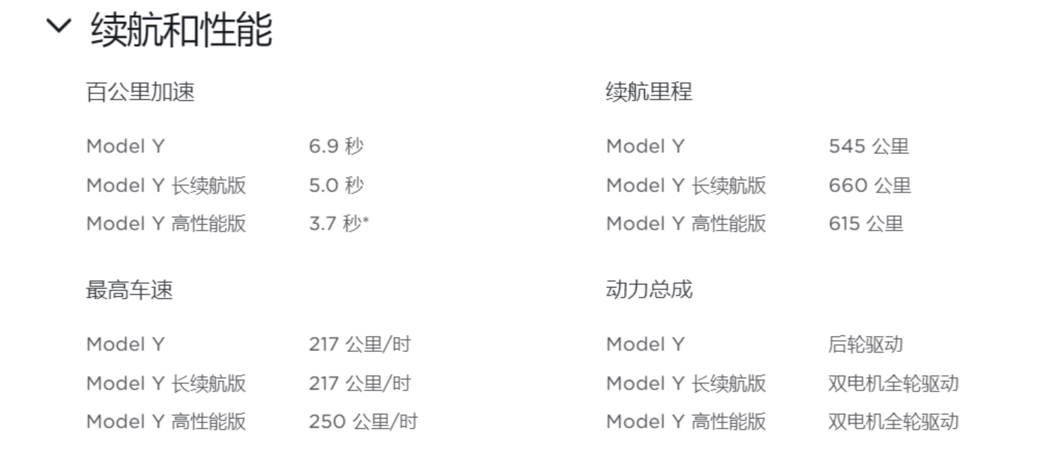 Model Y百公里加速最高可达3.7s,最高时速为250km/h,续航最高可达660km。