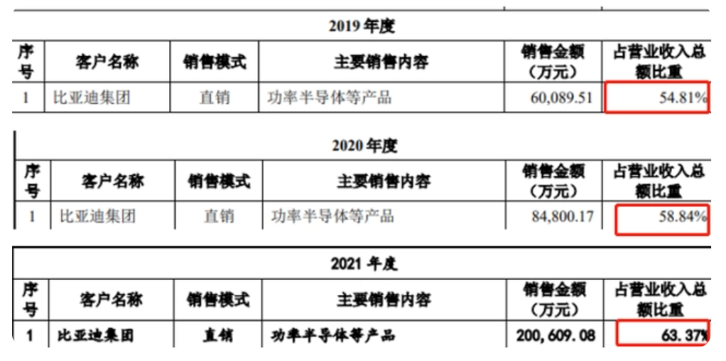 根据招股书,2019年至2021年期间,比亚迪半导体向比亚迪集团销售金额占营业收入总额比例分别为54.81%、58.84%和63.37%,可见两者的关联交易占比呈扩大之势。