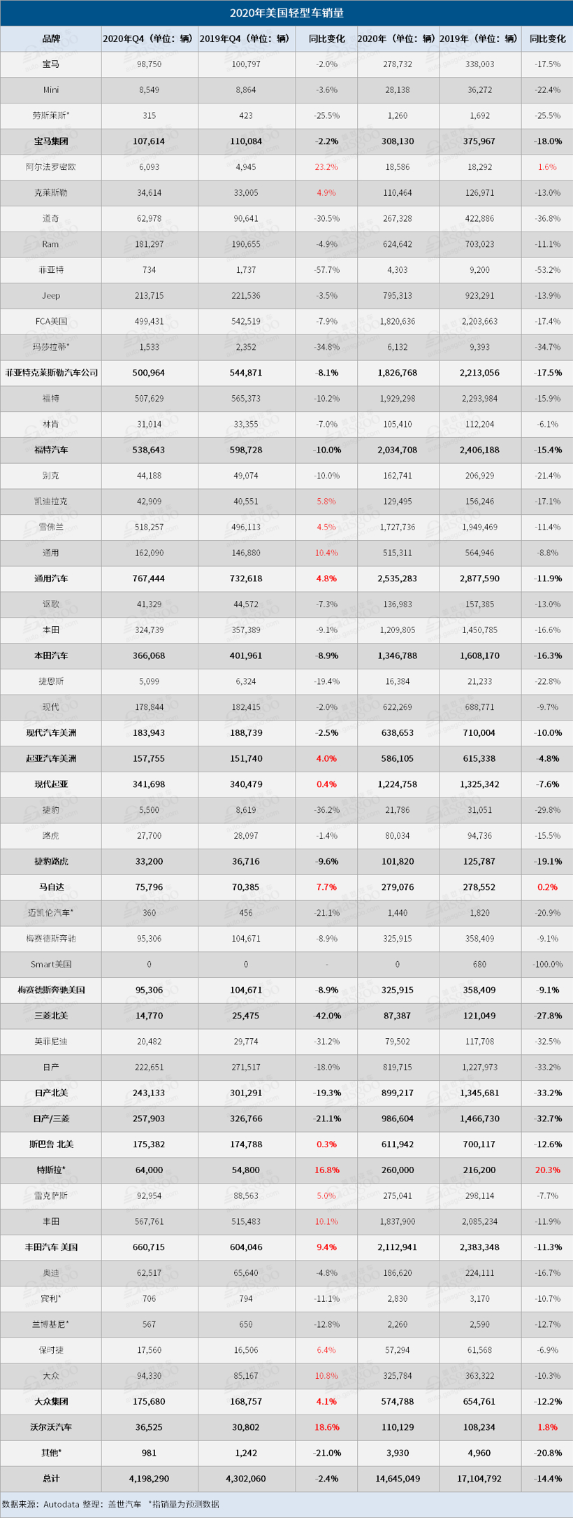 其中,在去年第四季度,美国轻型车总销量约为420万辆,同比微跌2.4%,反应美国车市继续从疫情中复苏,下半年的稳步反弹一定程度上挽救了上半年的颓势。17大车企中,通用汽车、丰田汽车、大众集团、斯巴鲁、起亚和马自达去年第四季度在美国的销量均出现增长,特斯拉和沃尔沃汽车甚至实现两位数的增幅;相比之下,福特汽车、FCA、本田汽车和日产汽车等车企去年第四季度在美国的销量均有所下降。