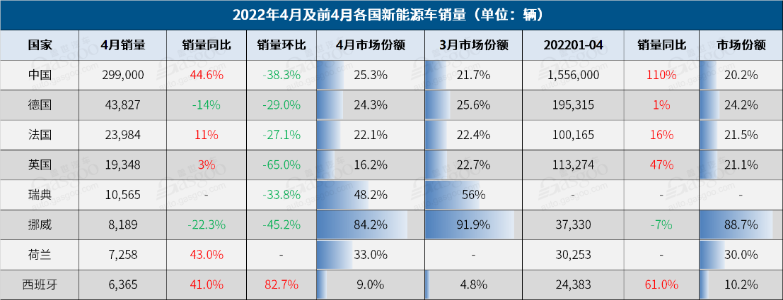 4月份,在全球车市进一步下探的背景下,新能源车细分市场多少也受了点影响,例如德国原本蓬勃发展的电动车市场已是连续第二个月出现同比下跌,英国和法国的电动车销量也没能继续获得明显的增长。但总体上来看,各国新能源车销量大多高于上年同期水平,成为当月车市的一大亮点。