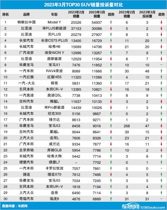 本文标题:2023年3月TOP30 SUV销量投诉量对应点评