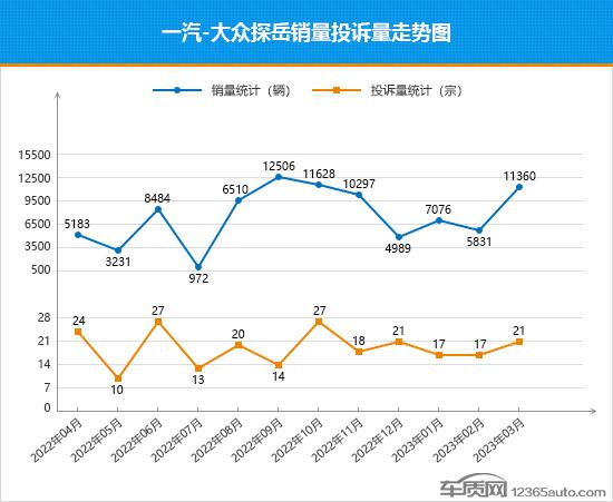 作为一汽-大众旗下的热销SUV车型,探岳近两年的市场表现不温不火,连续两年的年销量未能突破10万辆。从其近一年来的销量投诉量走势可以看到,月销量走势波动明显,特别是自2022年四季度开始,月销量出现连续下行趋势。不过,这样的下降势头在3月份戛然而止,大幅反弹后的月销量再次重返“万辆俱乐部”,但今年1-3月的累计销量与去年同期相比仍有一定差距。反观其近一年来的月投诉表现,在2022年二、三季度同样充满了波动,投诉集中在“排气故障”和“油耗高”,但从2022年四季度开始,探岳的月投诉量有所下降,且走势保持平稳,短期口碑表现有向好趋势。在2022年下半年完成中期改款后,探岳或将在即将开幕的上海车展上推出1.5T车型,以取代现有的1.4T车型。在新车型和日趋稳定的口碑助力下,探岳的市场表现有望短期持续回暖。