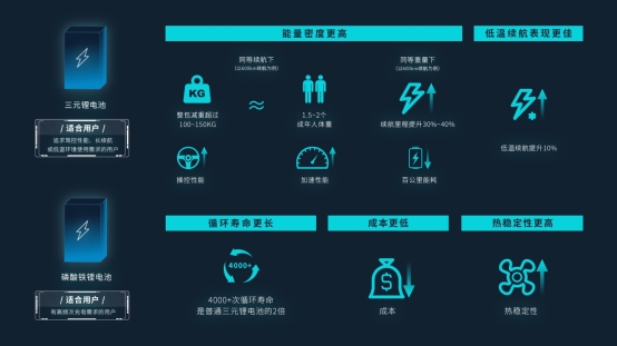 三元锂在同等续航(600km)情况下,电池整包的重量能比其它磷酸铁锂电池减重超过100-150kg,相当于1.5-2个成年人的体重。整车的轻量化,能够让车辆的操控性能和加速性能得到明显提升,适合追求驾控性能和超长续航的客户;其次,三元锂电池在低温环境下的续航能力比磷酸铁锂电池高约10%,在冬季会实现更长的续航表现。而磷酸铁锂则具有4000+次的超高循环寿命,是其他三元锂电池的两倍,同时成本更低,适合有高频次充电需求的客户。因而,磷酸铁锂电池、三元锂电池两种技术路线能满足用户不同的出行需求。