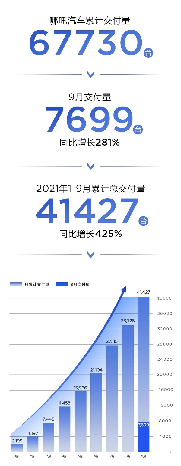 与此同时,刚刚过去的9月,据哪吒公布的终端成绩显示,交付量首次突破7千大关,达到7,699辆,环比增长16.4%,同比增长281%,连续8个月创下交付量纪录。今年前9个月,累计交付新车已达到41,427辆,同比增长超过4倍。