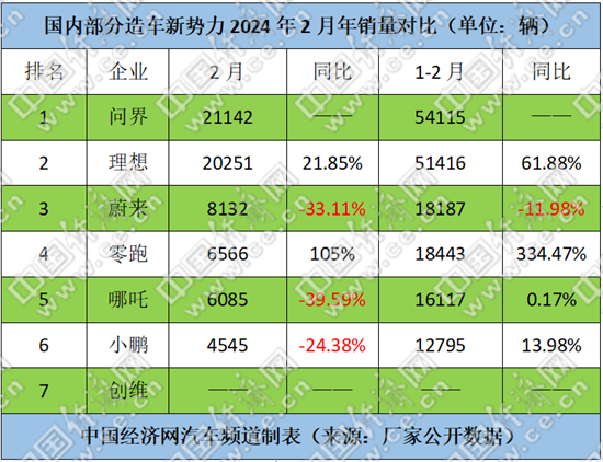 前2个月,问界、理想、蔚来、零跑、哪吒和小鹏的销量分别为54115辆、20251辆、8132辆、6566辆、6085辆、4545辆;其中,理想、蔚来、零跑、哪吒和小鹏同比分别增长61.88%、-11.98%、334.47%、0.17%、13.98%。