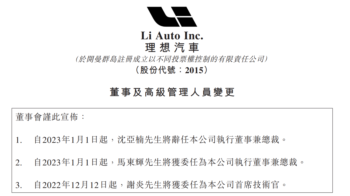 本文标题:理想汽车:马东辉接棒沈亚楠任董事兼总裁